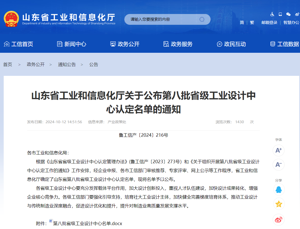 近期,山东省工业和信息化厅公布了第八批省级工业设计中心认定名单。经企业申报、各市工信部门审核推荐、专家评审、网上公示等程序,新得利(中国)科技成功取得“省级工业设计中心”资质认定。